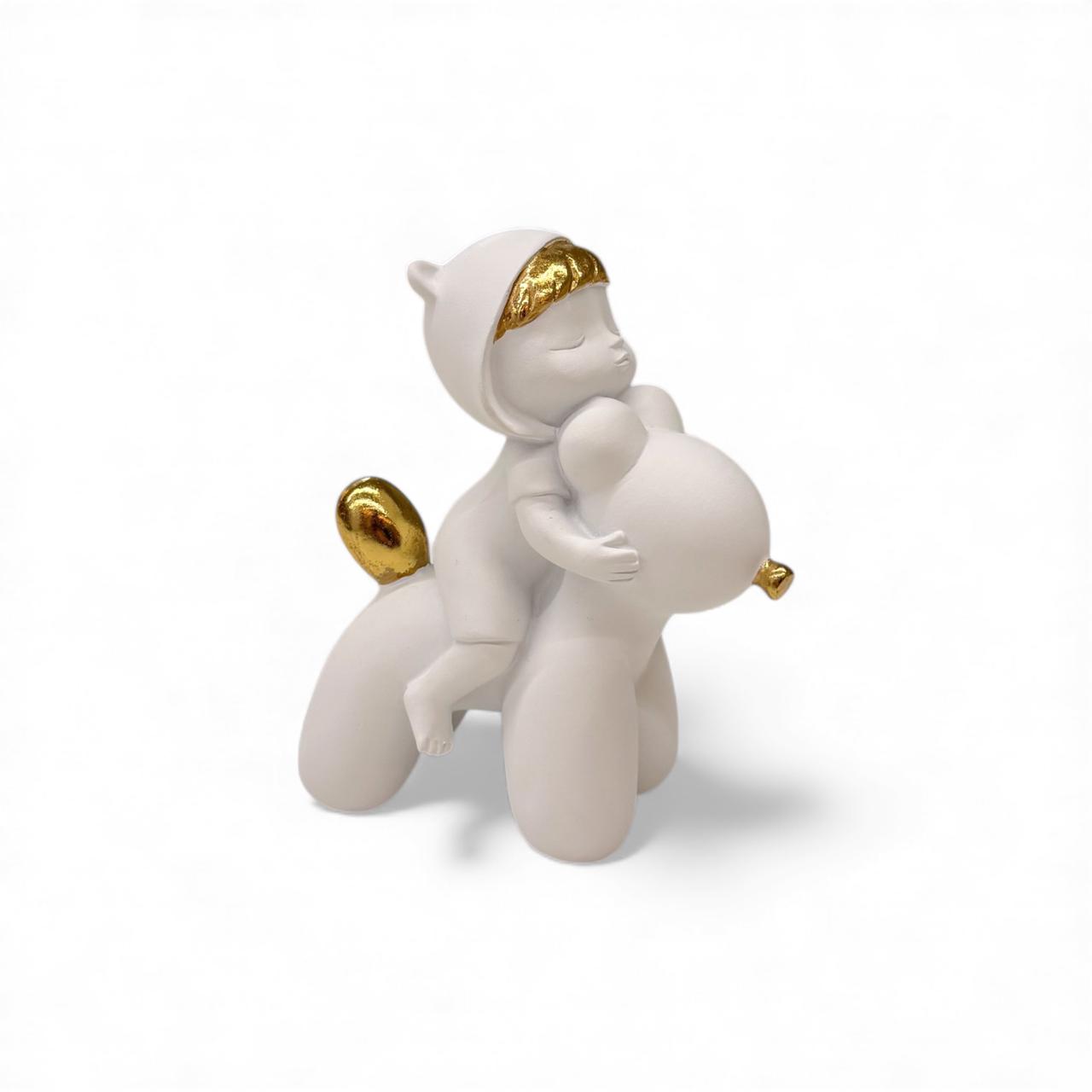 Escultura em resina na cor branca de uma menina em cima de um cachorro com detalhes em dourado. O item ideal para compor e modernizar o seu ambiente.