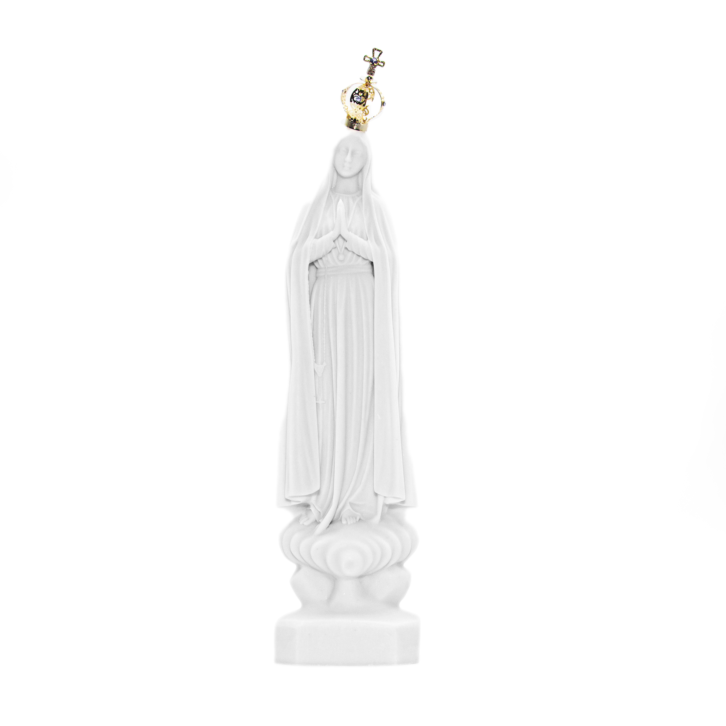 Imagem de Nossa Senhora de Fátima em pó de mármore na cor branca, com coroa em metal dourado com detalhes em pedras azuis. O item ideal para compor de forma delicada e especial o seu ambiente.
