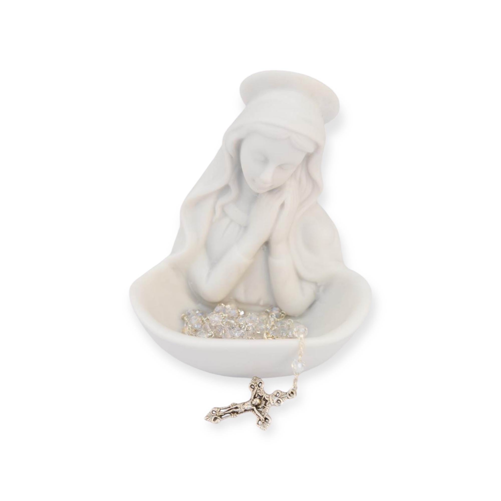 Imagem que é utilizada como porta rosário, esculpida em pó de mármore na cor branca. Uma peça exclusiva e única para dar um toque especial e sentimental ao seu ambiente.