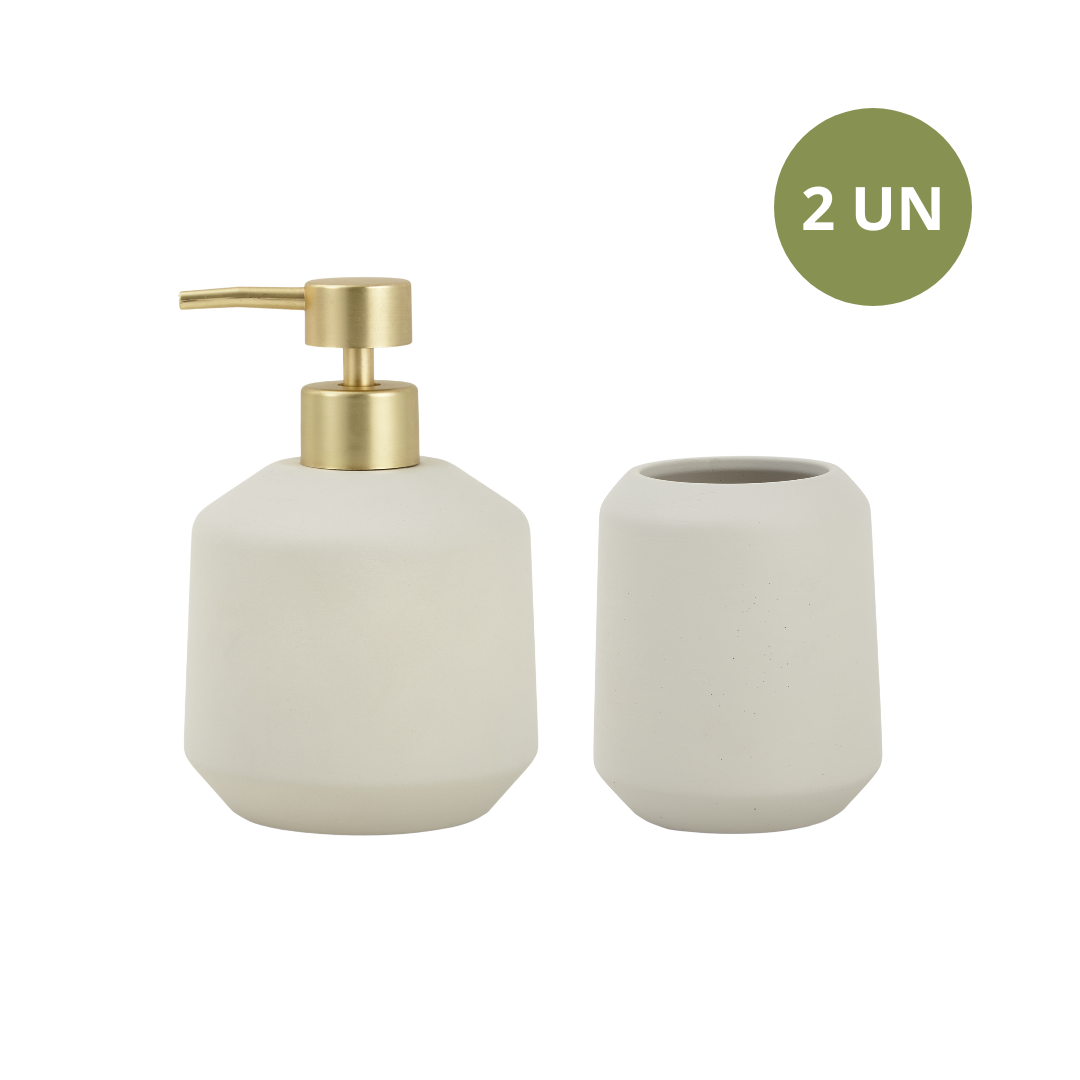 Kit para banheiro na cor cinza e detalhe em dourado em cimento. Acompanha copo e porta-sabonete. O conjunto ideal para compor o seu banheiro.