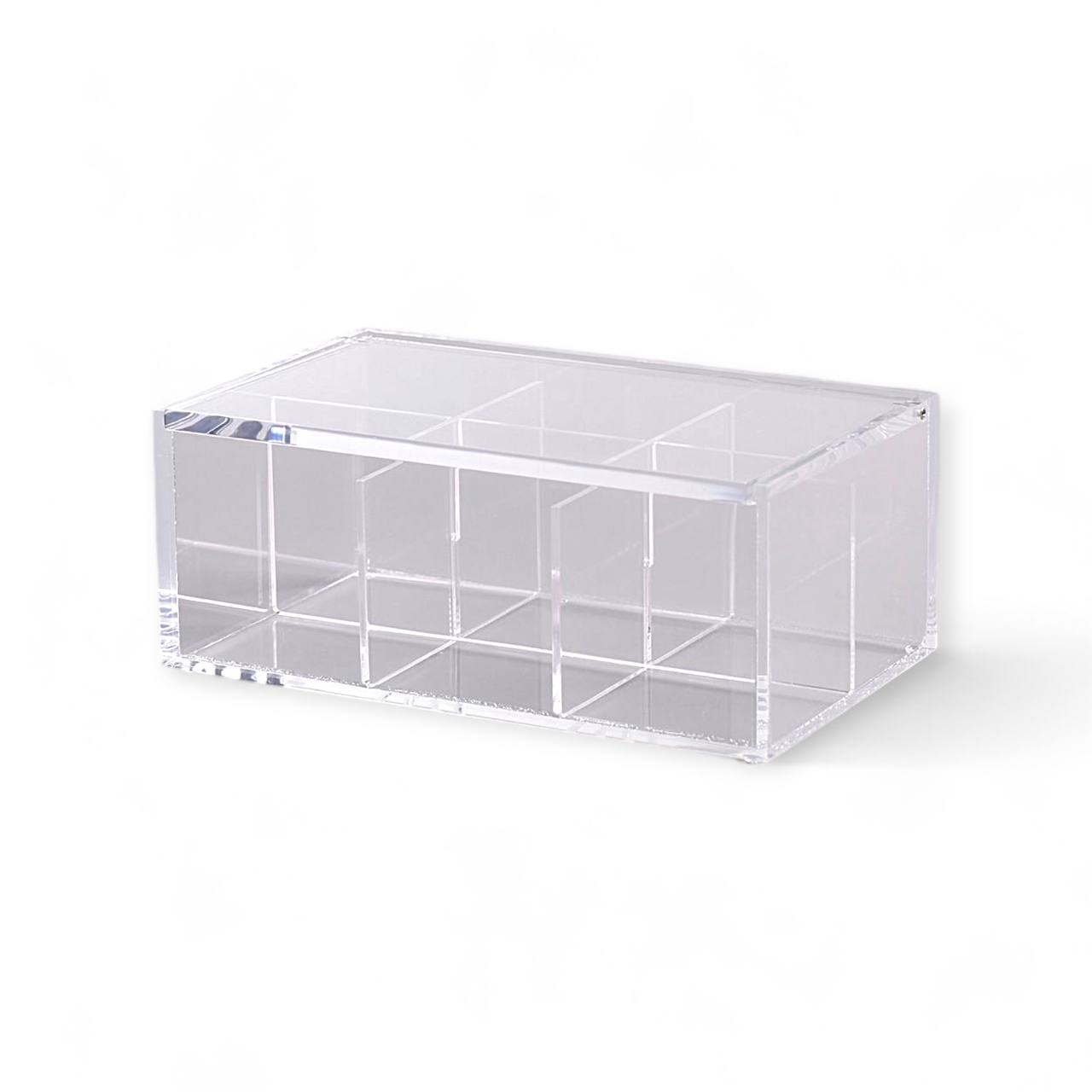 Caixa para chá com 6 divisórias e tampa flexível em acrílico. O item ideal para armazenar além de compor o seu ambiente.