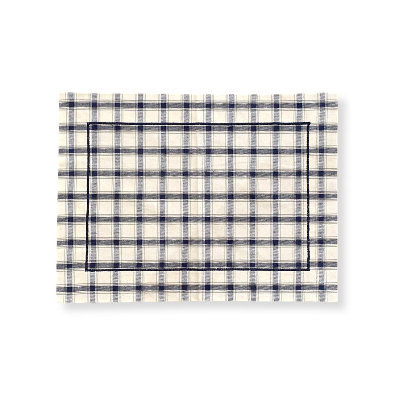 Jogo americano retangular xadrez azul e bege.