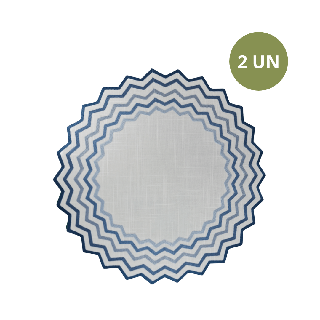 Set com 2 Jogos americanos redondos com zig zags brancos com bordado azul e com diâmetro de 40cm.