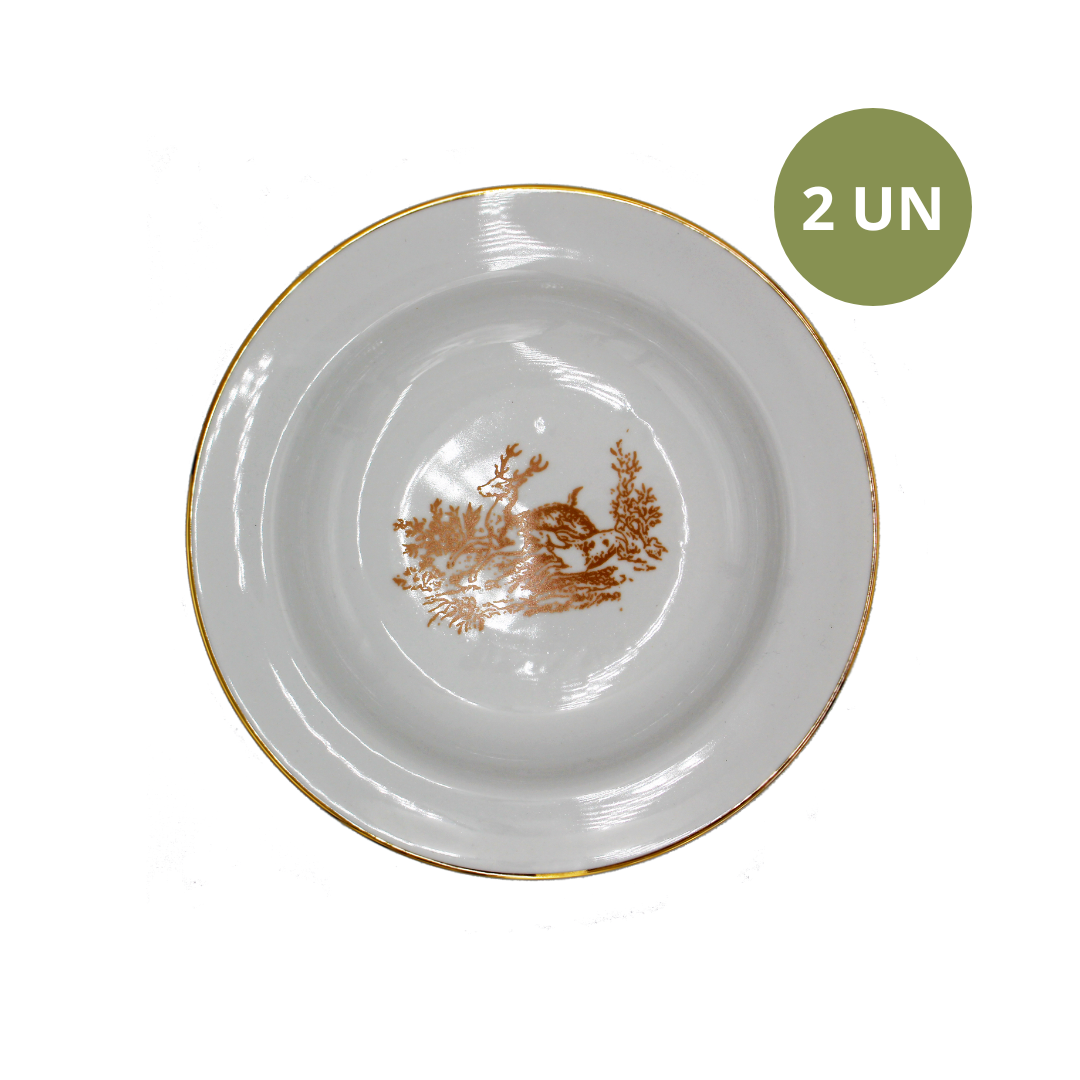 Set de jantar de porcelana branca com estampa de flores e renas na cor nude e com filete em ouro. O set de jantar contém 2 pratos fundos de 23,5cm de diâmetro.