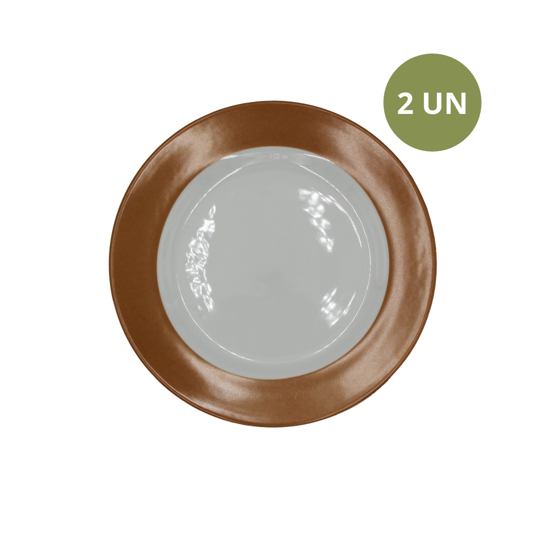 Set de jantar de porcelana branca com estampa de flores e renas na cor nude e com filete em ouro. O set de jantar contém 2 pratos rasos de 26,5cm de diâmetro.