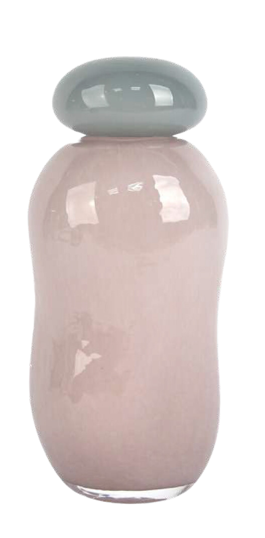 Vaso de vidro na cor rosa com uma tampa também em vidro na cor cinza. O vaso ideal para decorar e compor o seu ambiente.